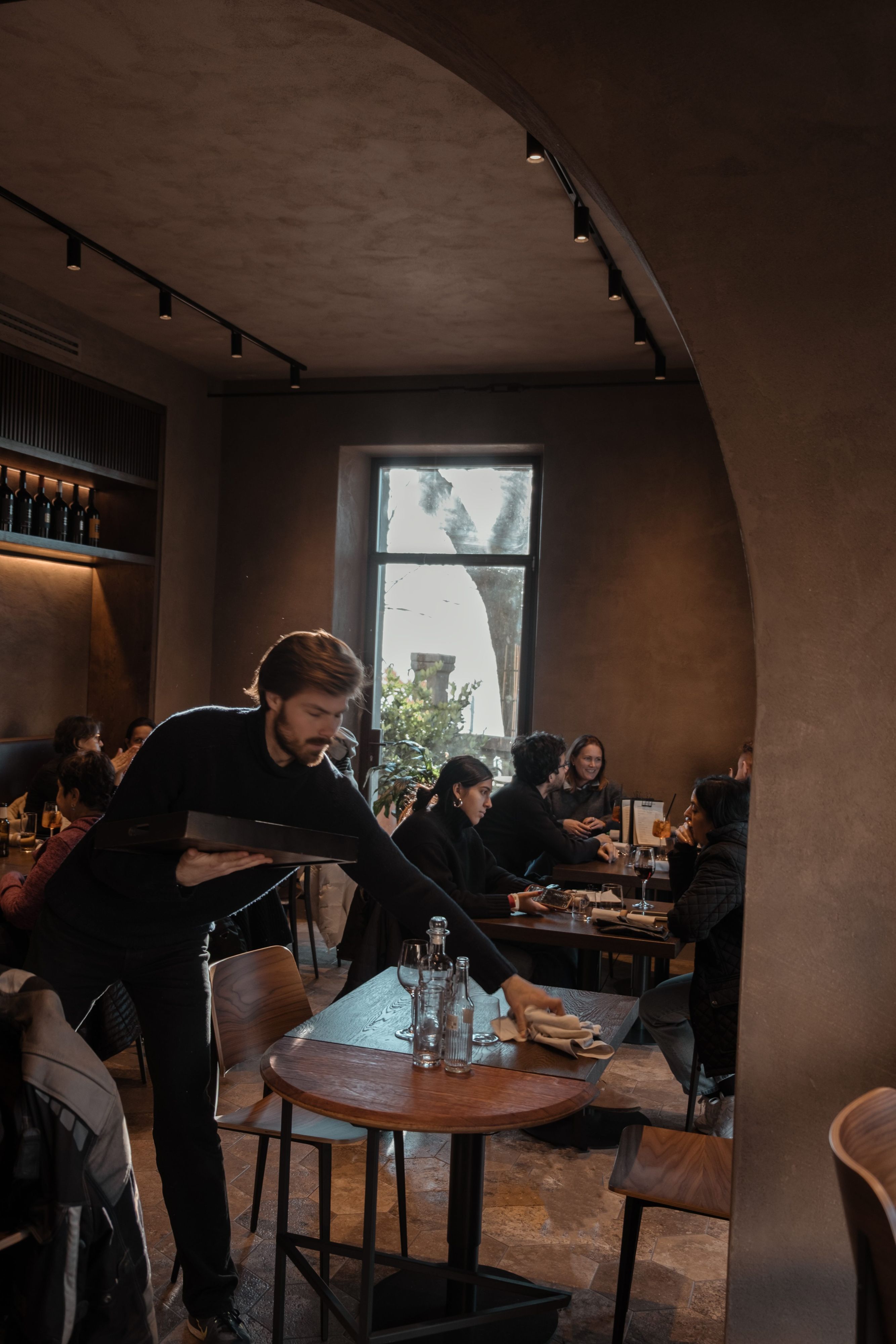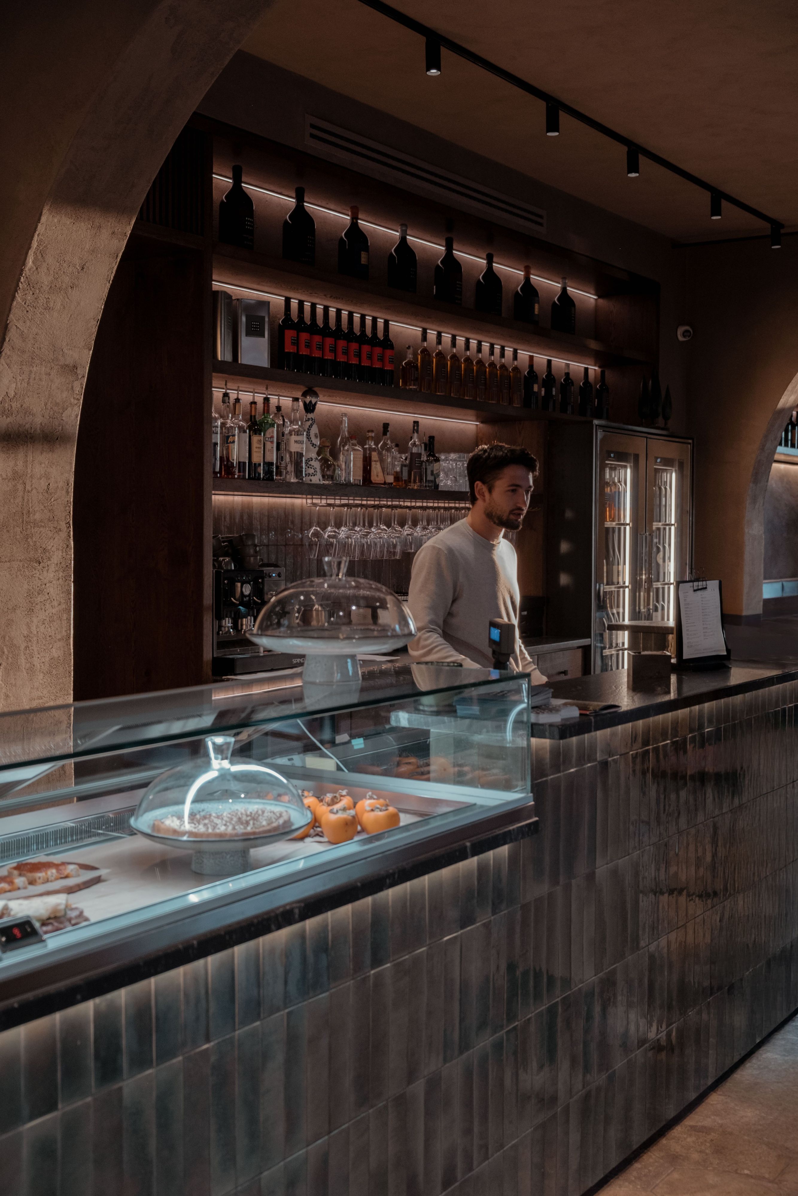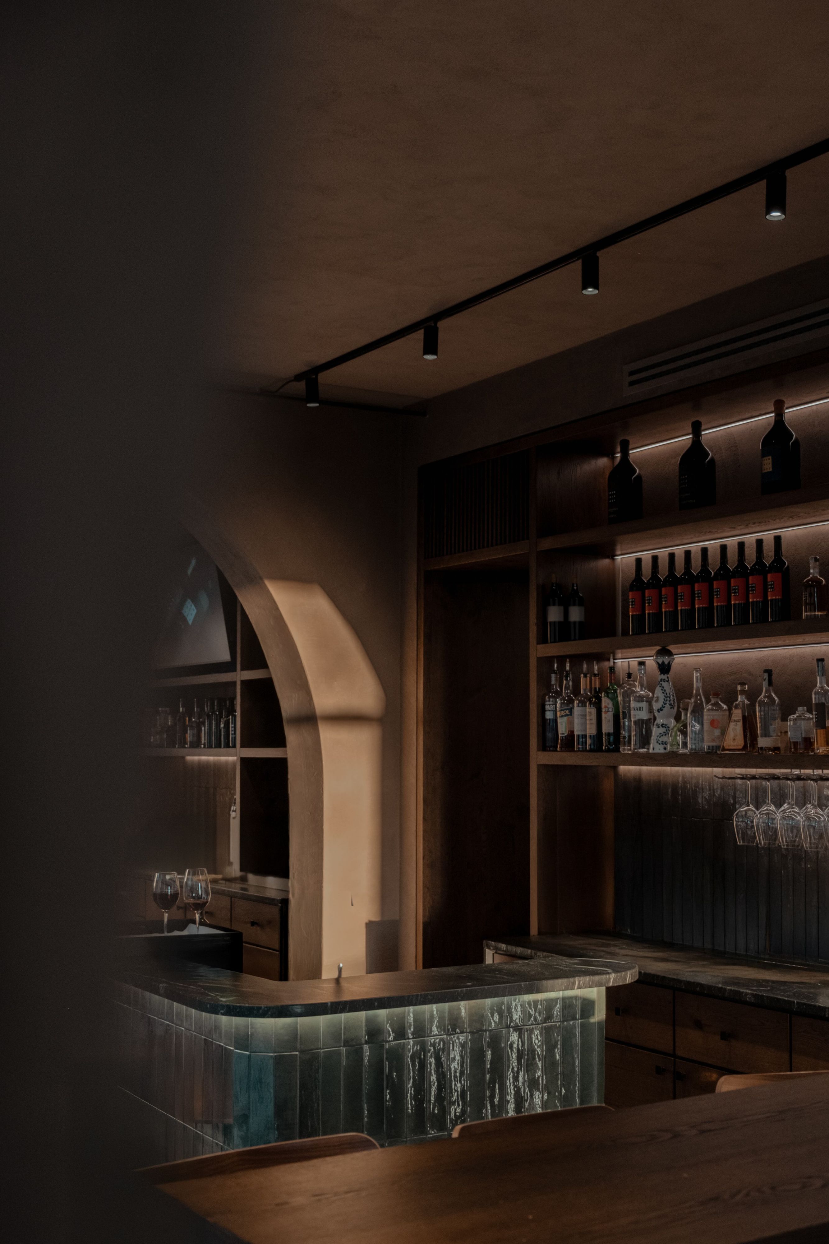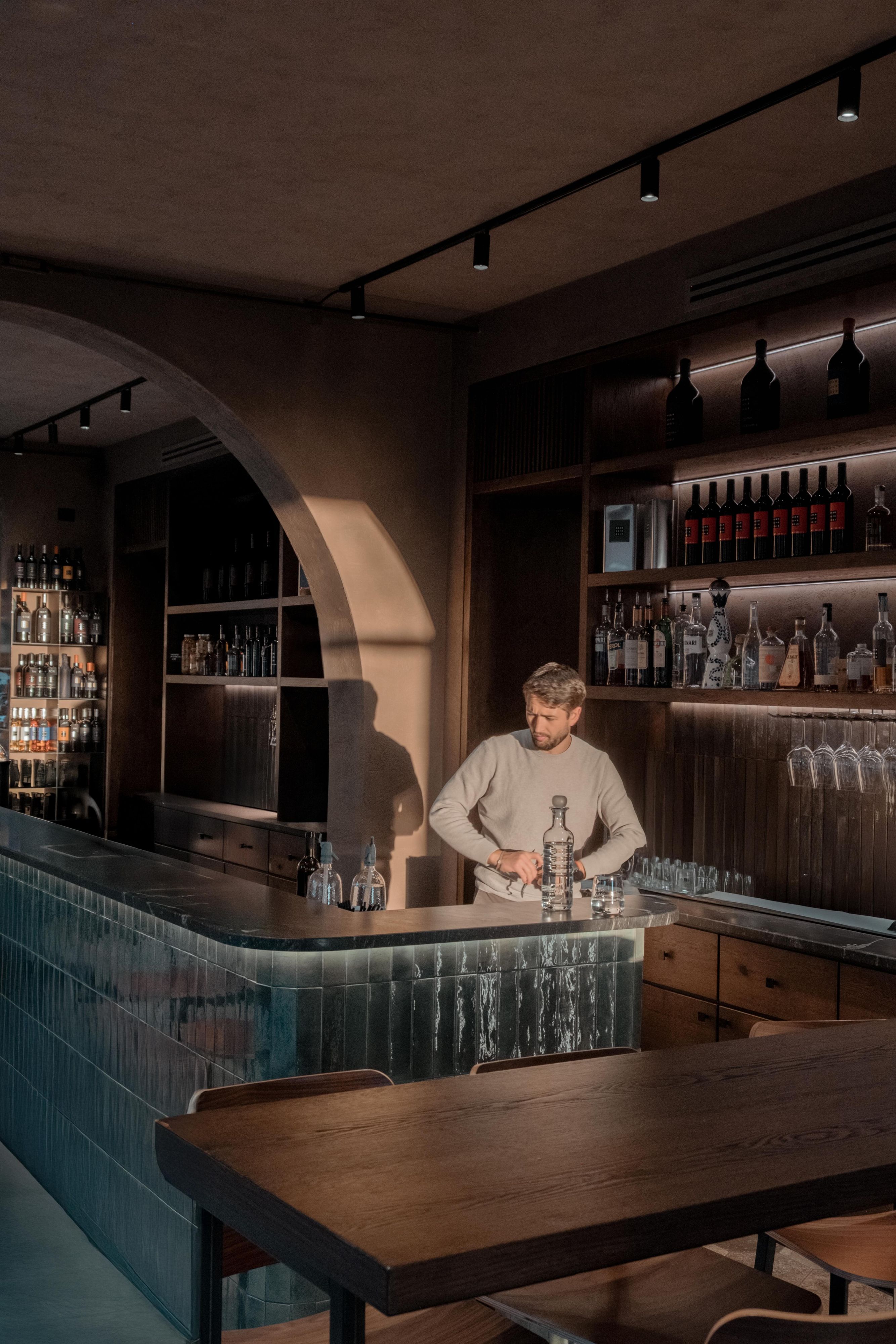 Bar Brancaia is a bar in the Chianti Classico hills, realised for a winemaker—an intimate place designed to frame the surrounding landscape. Inserted into a robust existing structure with sculpturally shaped columns, three plastered arches articulate the space and choreograph views towards the terrace and across the valley. A warm, pigmented clay-plaster finish and dark-stained timber built-ins add earthy depth, while the bar front—finished in blue-green glazed ceramic—sets a defining material statement. The result is a reduced, craft-driven bar that translates sustainability into durable materials and a timeless, precisely executed build.
