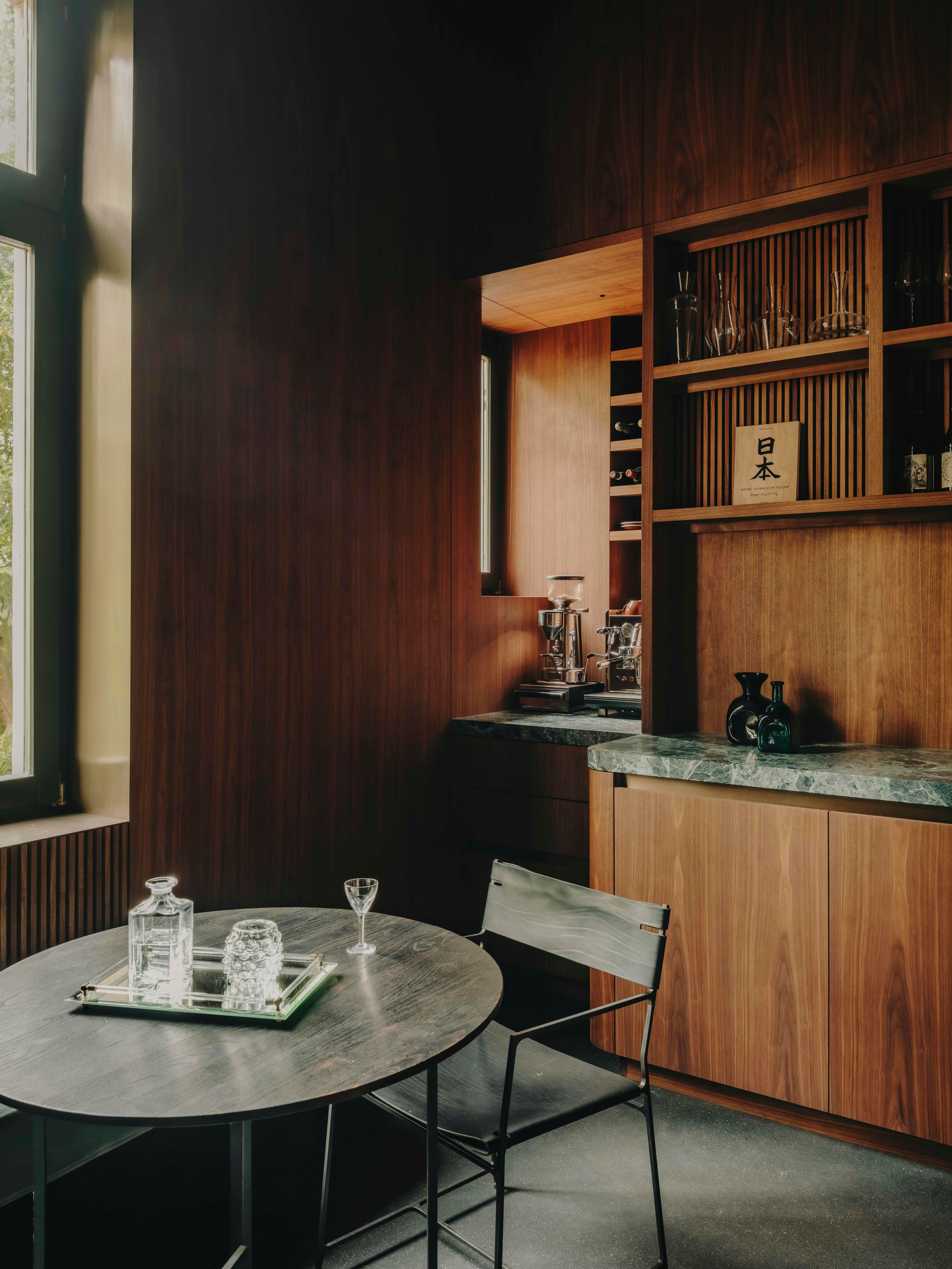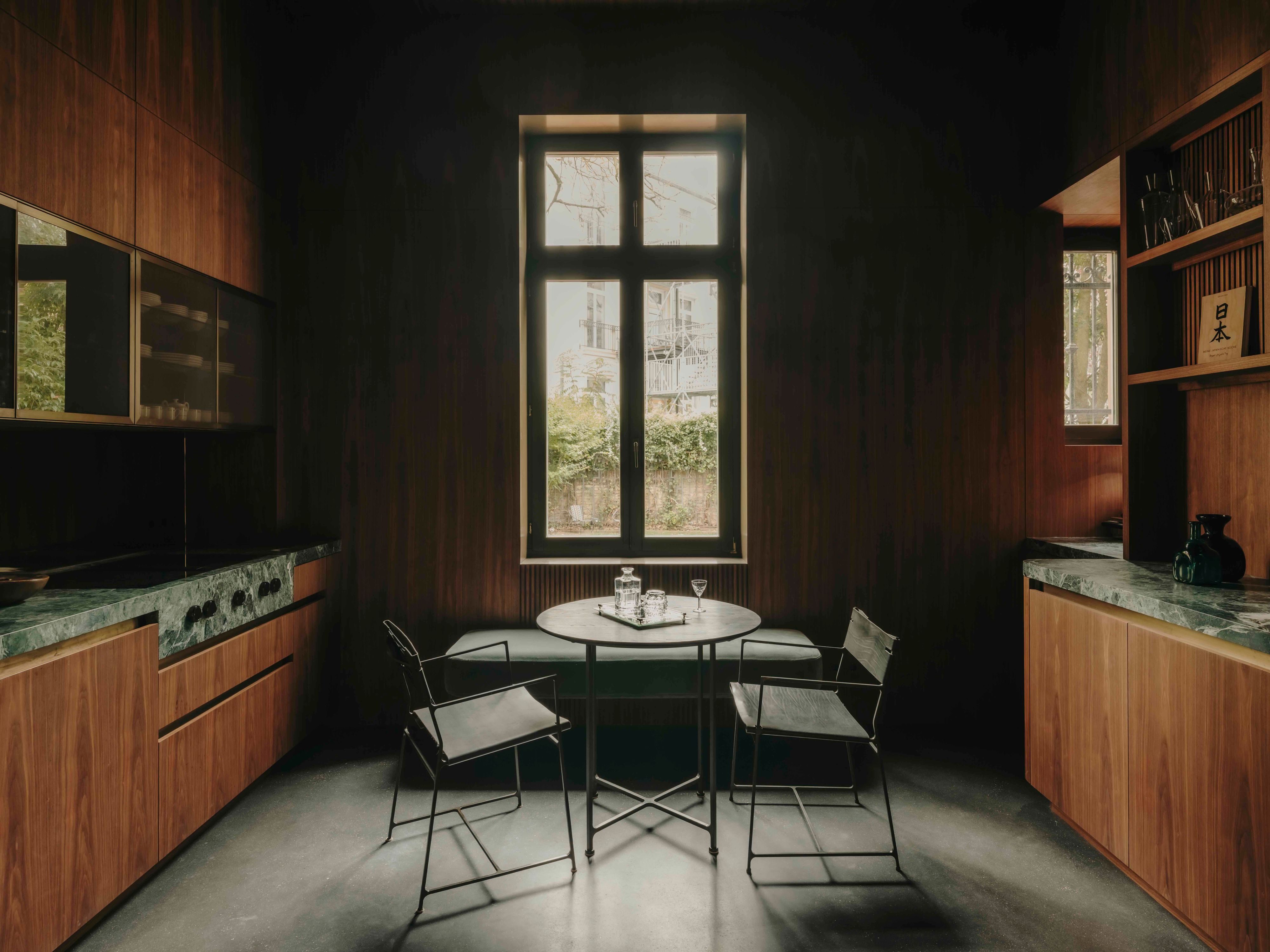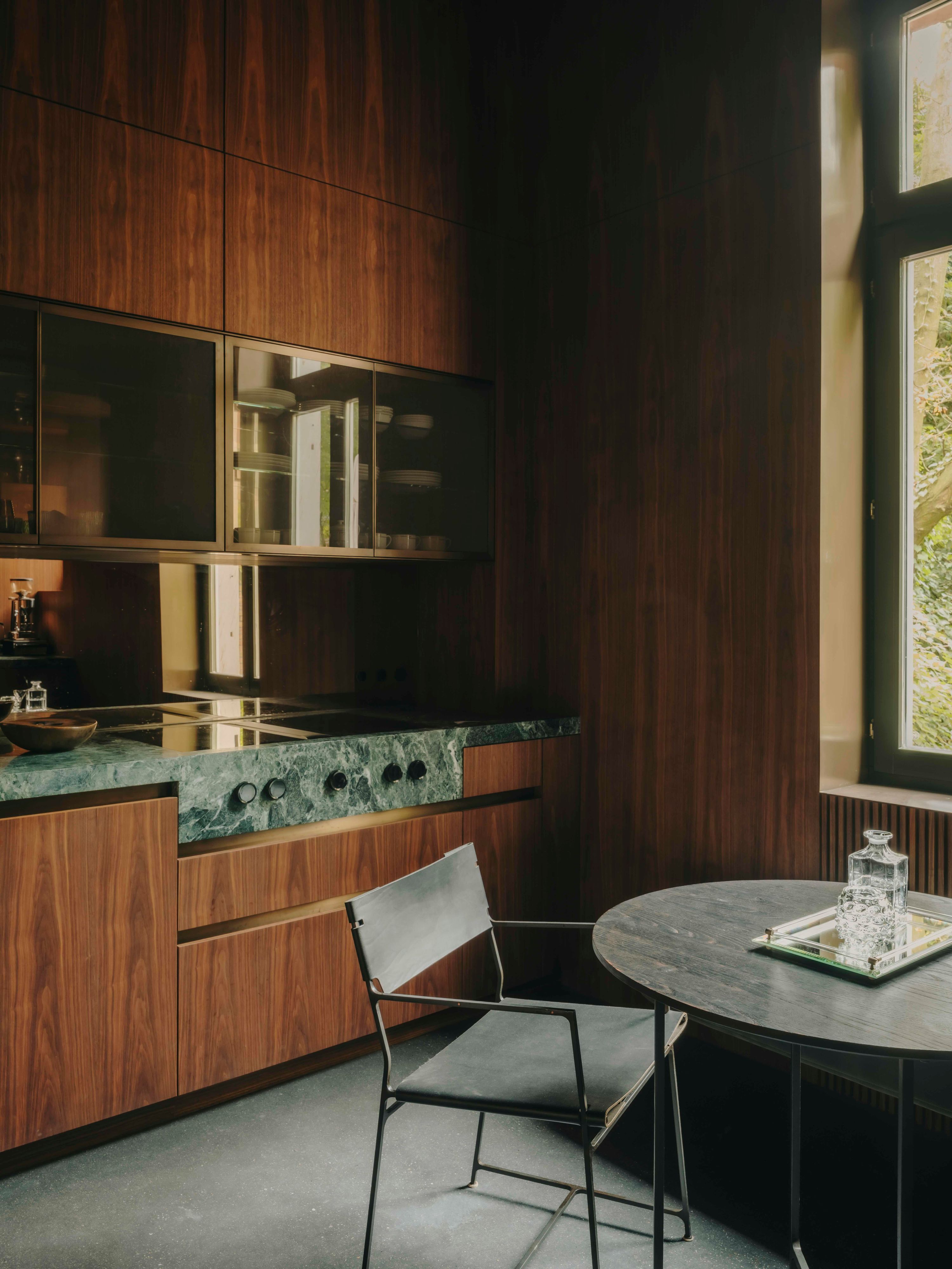 Francoforte × Brera Kitchen Bar is a contemporary kitchen insertion within a classic townhouse in Frankfurt’s Westend — set in a historical setting, intimate and material-driven. Framed by high ceilings, ornamental stucco, and herringbone parquet, the kitchen’s precise geometry is deliberately contrasted with the building’s original details. All surfaces — including walls, ceiling, and furniture — are executed in American walnut, combined with green natural stone, patinated brass, and a dark polished terrazzo floor.