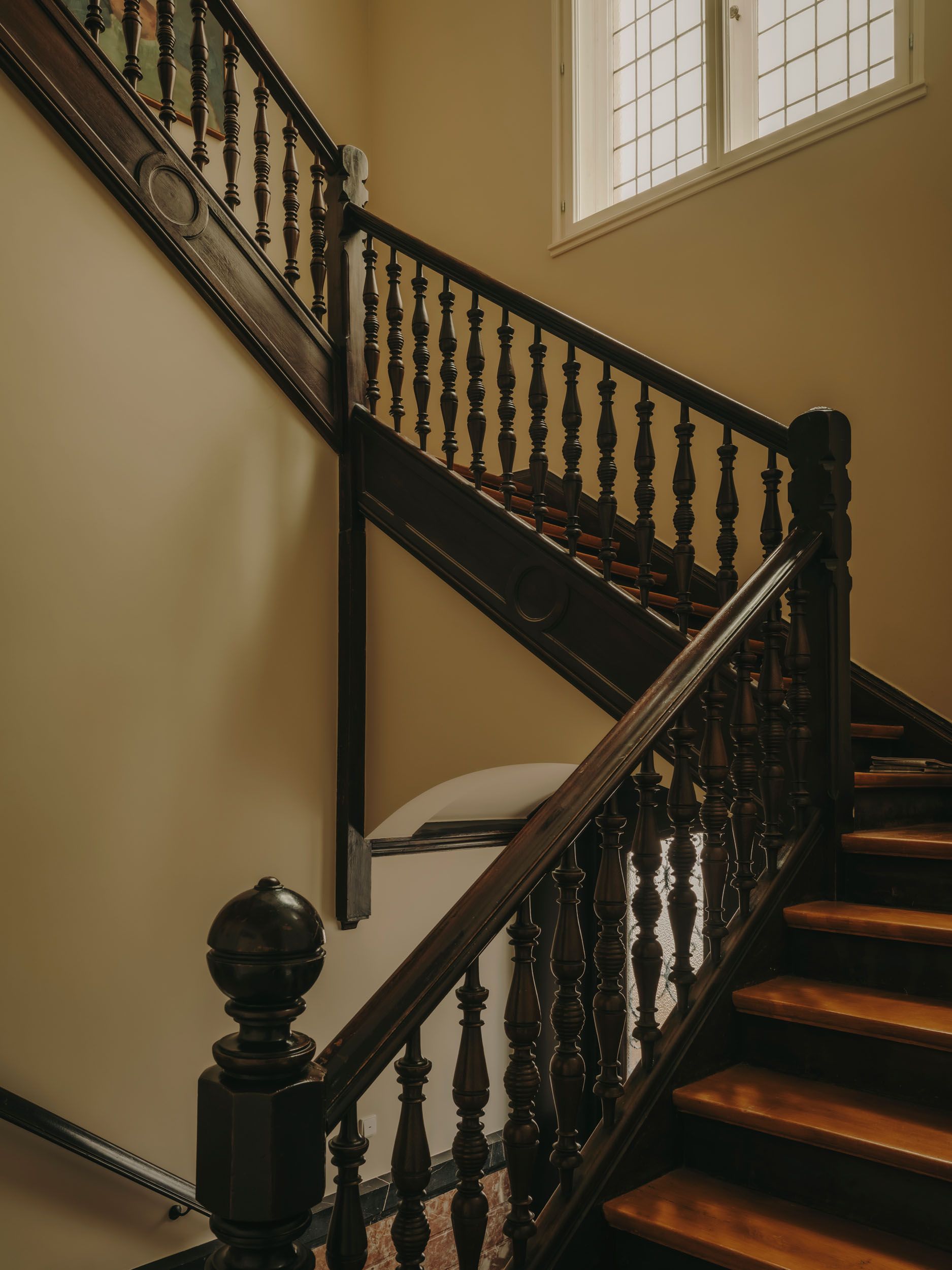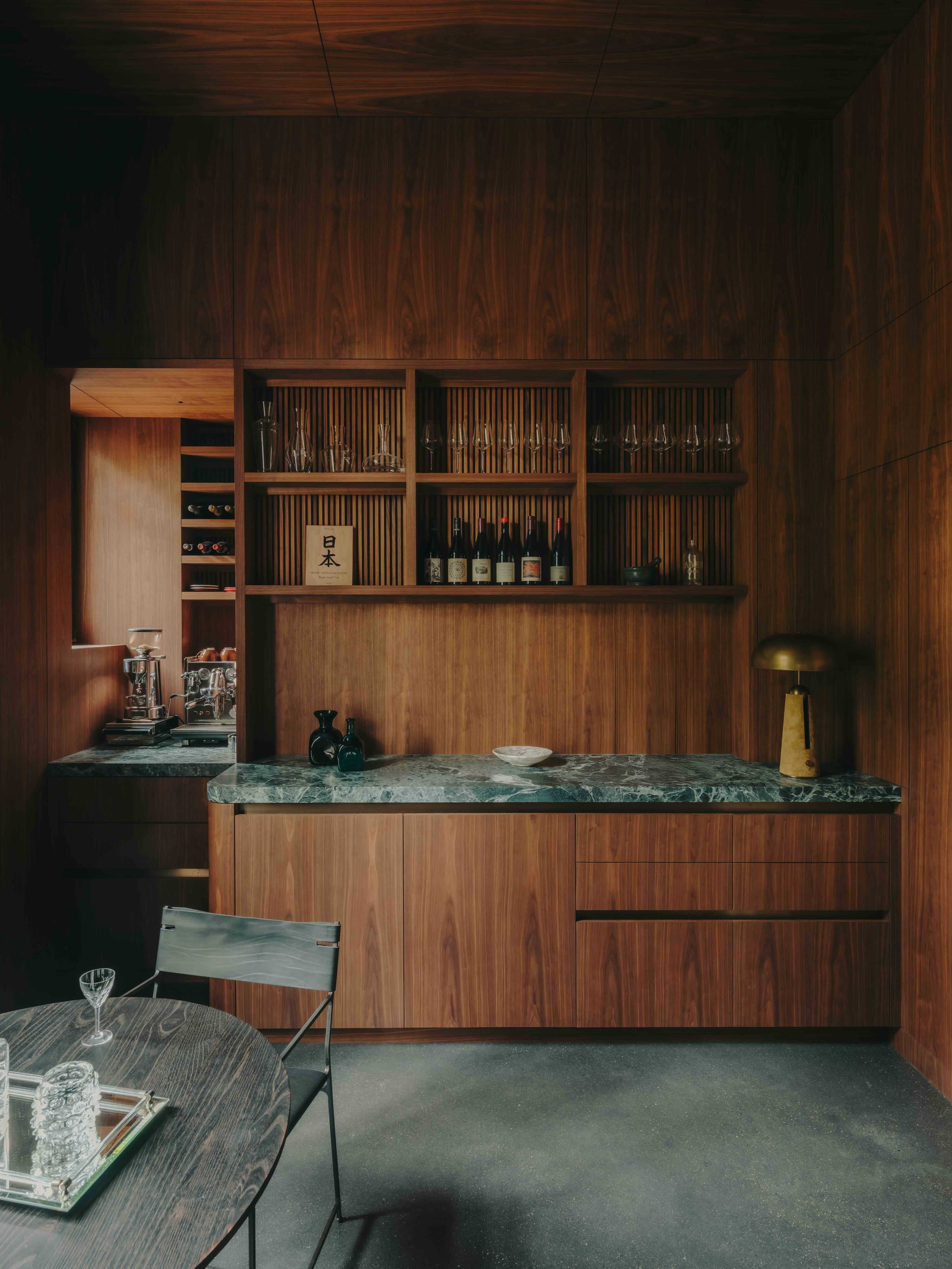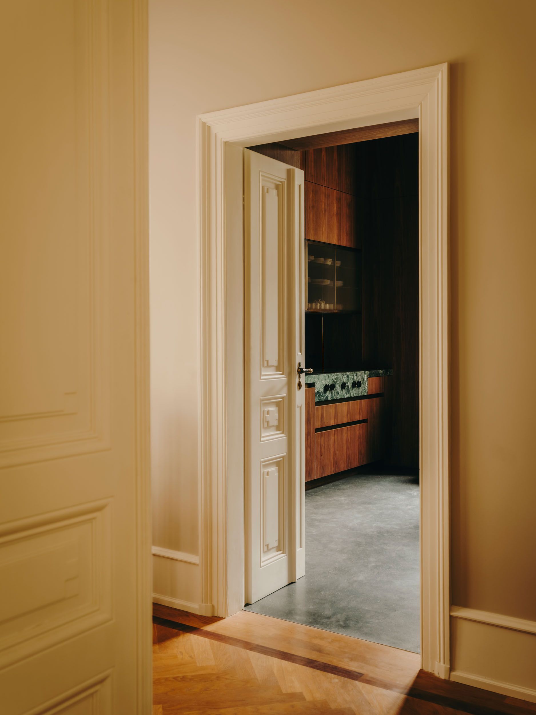 Francoforte × Brera Kitchen Bar is a contemporary kitchen insertion within a classic townhouse in Frankfurt’s Westend — set in a historical setting, intimate and material-driven. Framed by high ceilings, ornamental stucco, and herringbone parquet, the kitchen’s precise geometry is deliberately contrasted with the building’s original details. All surfaces — including walls, ceiling, and furniture — are executed in American walnut, combined with green natural stone, patinated brass, and a dark polished terrazzo floor.