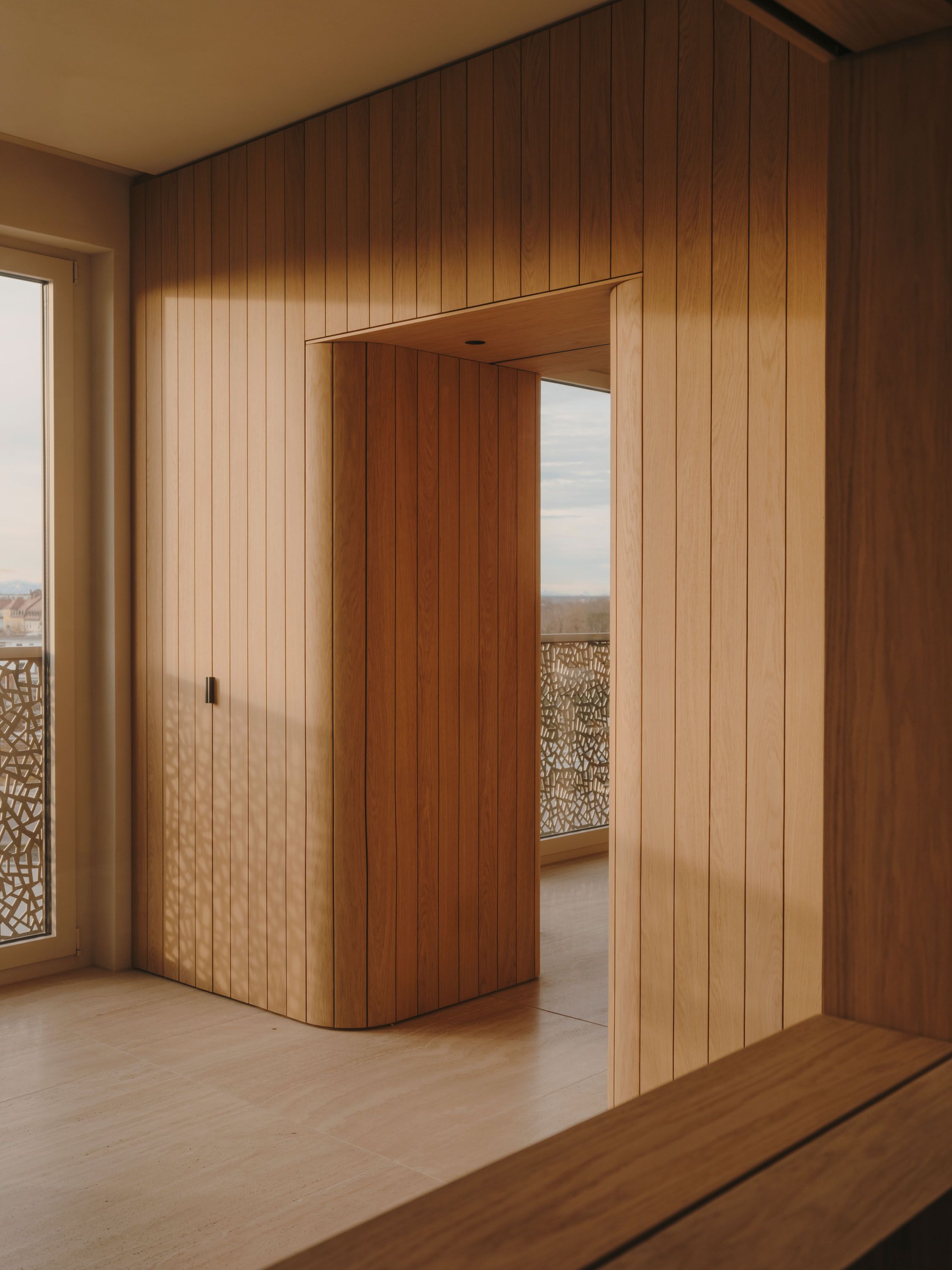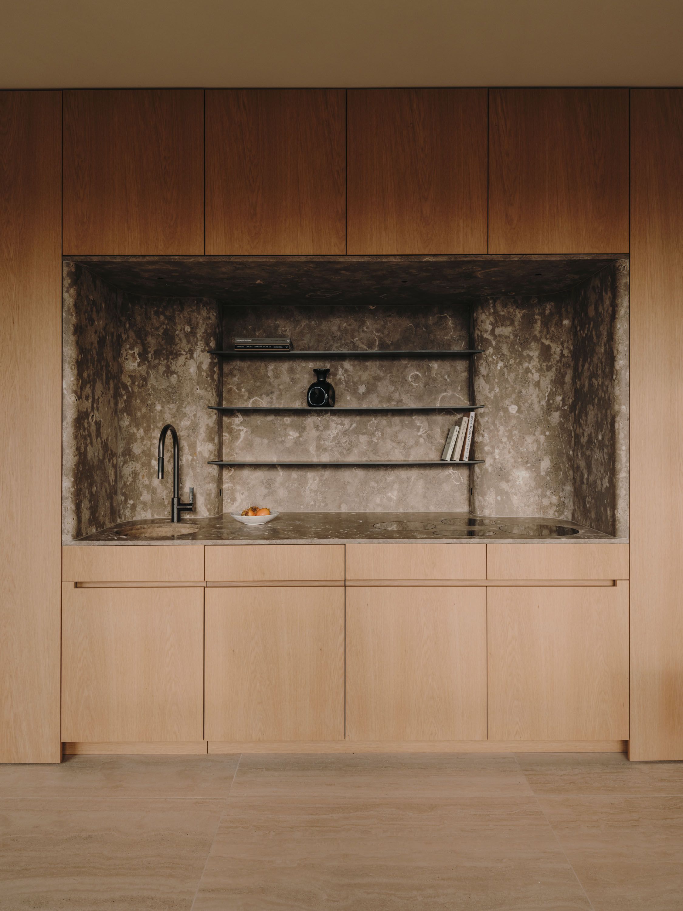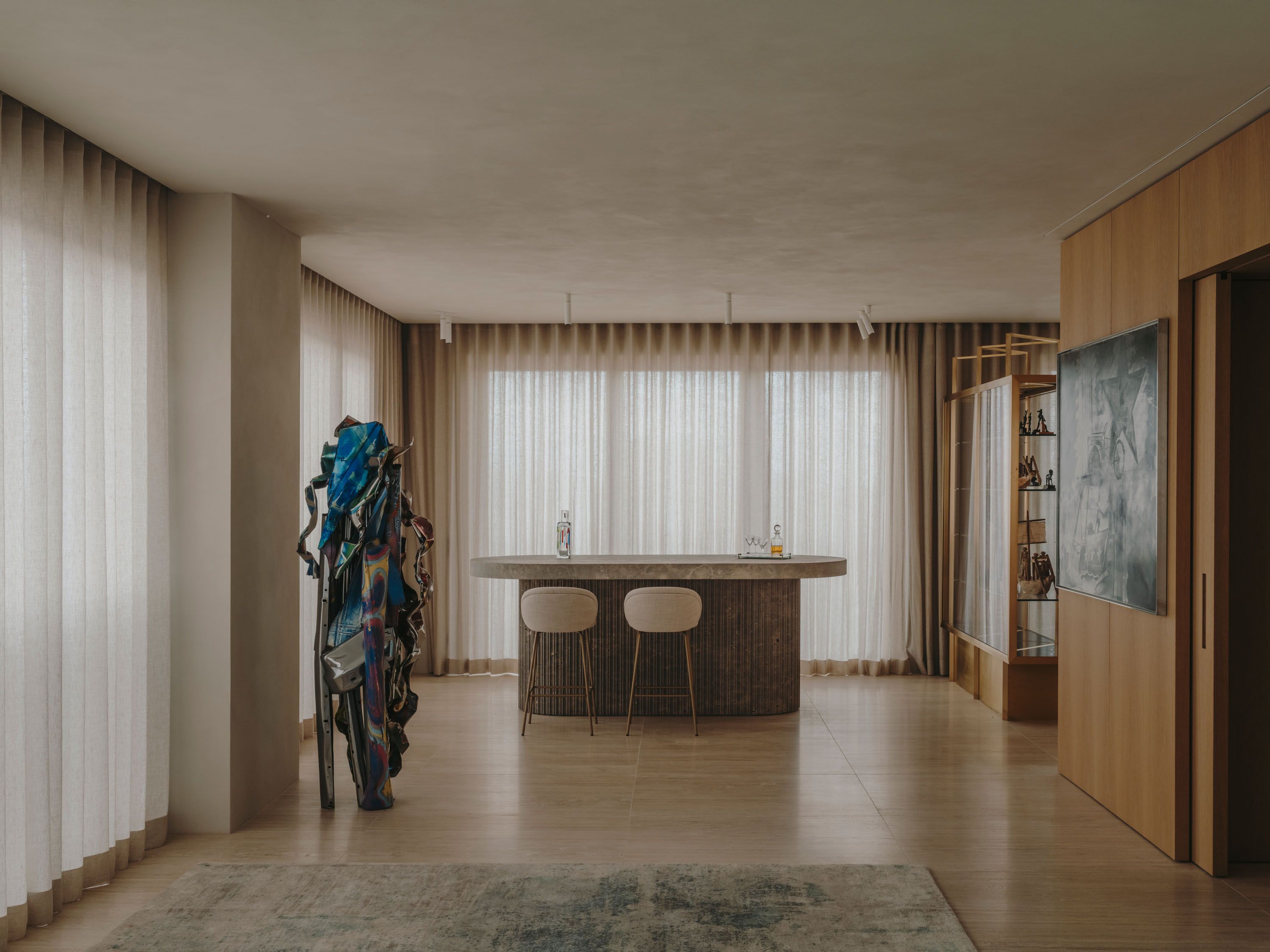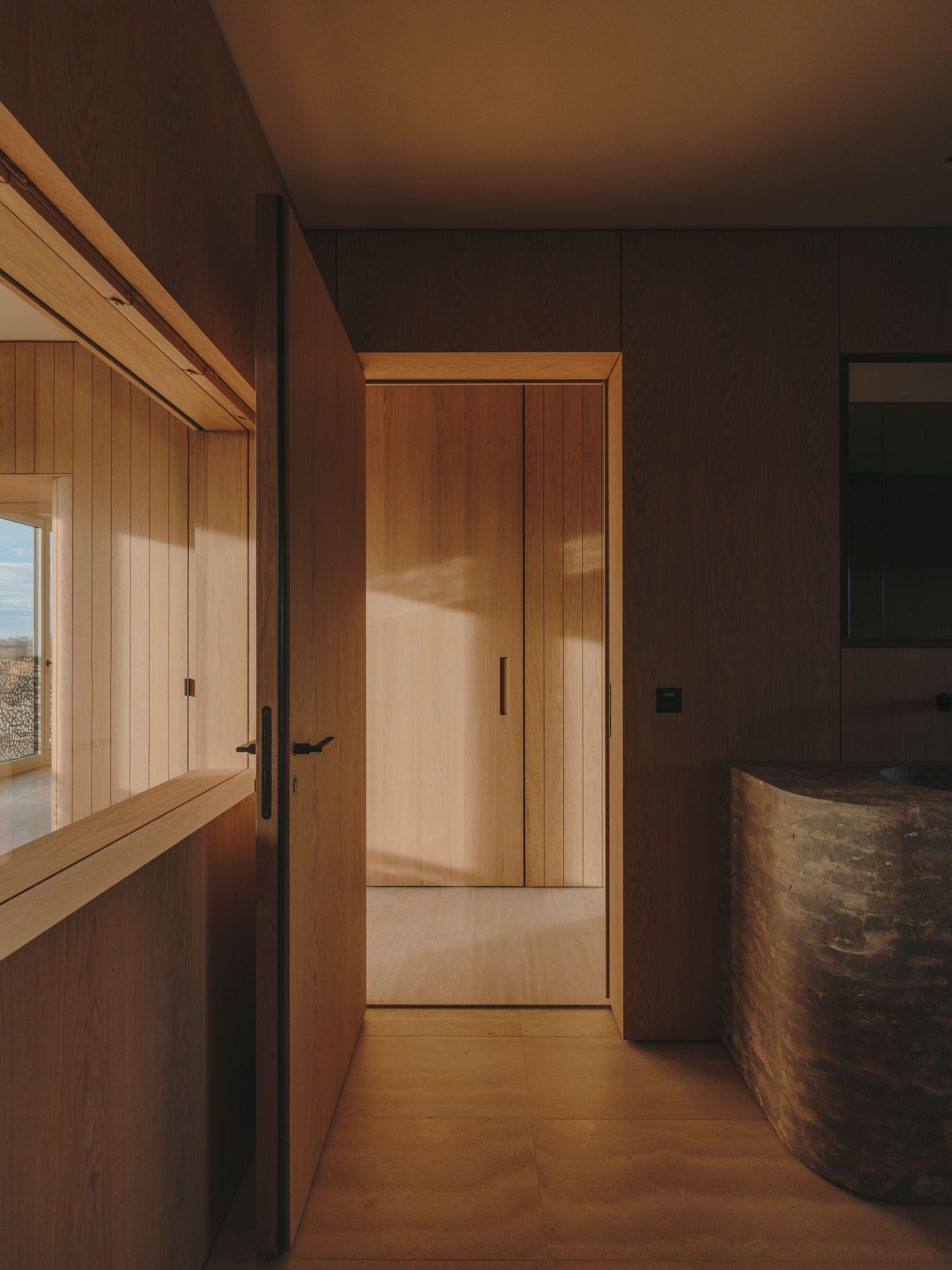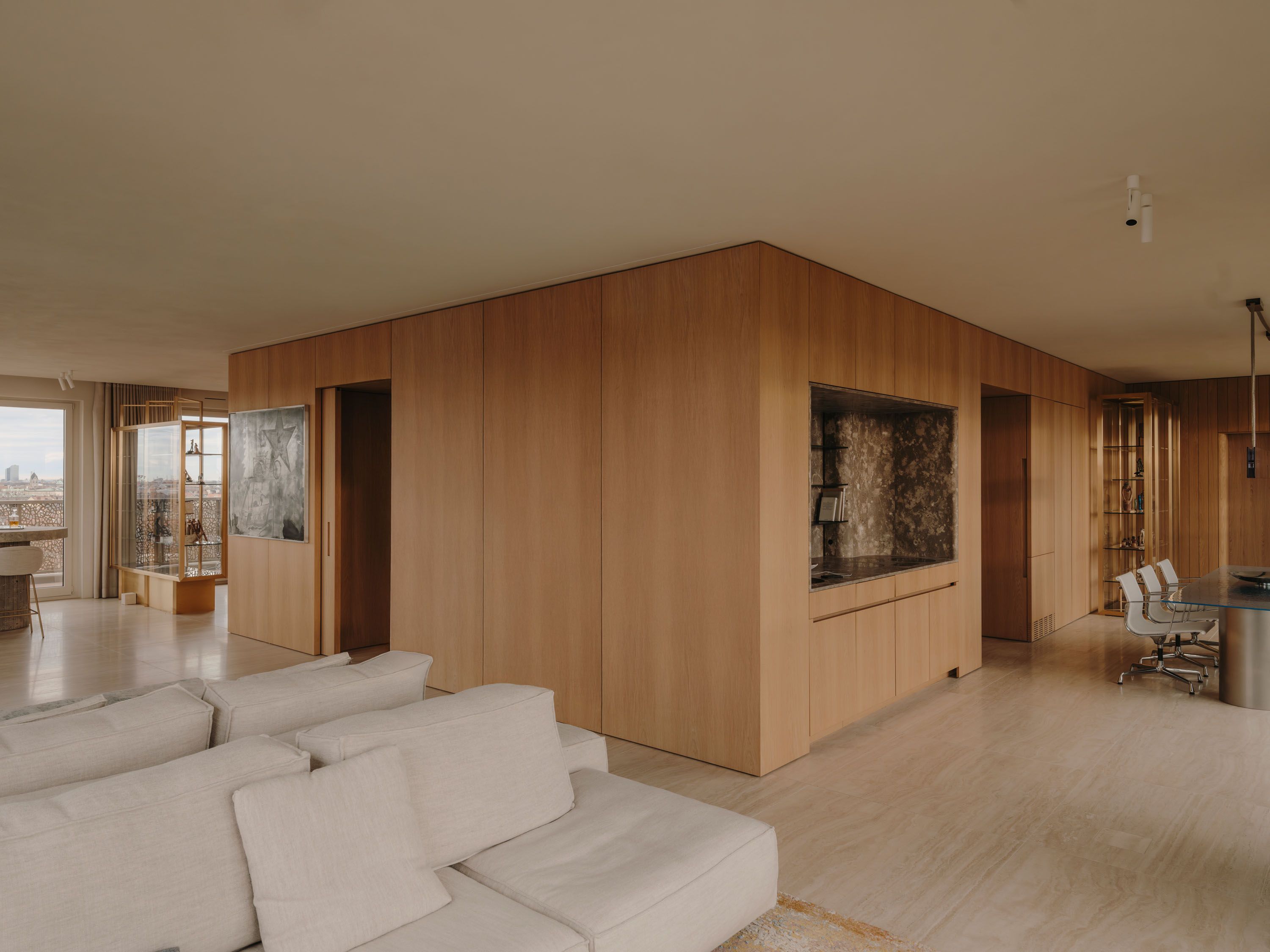 The wooden core integrates functional elements, forms a fluid circulation loop, and uses sliding doors for flexible zoning. The material palette includes travertine floors, Wachenzeller Dolomit washbasins as well as kitchen and bar surfaces, oak veneer built-ins, and Matteo Brioni plaster walls; it also supports the presentation of the client’s art collection.