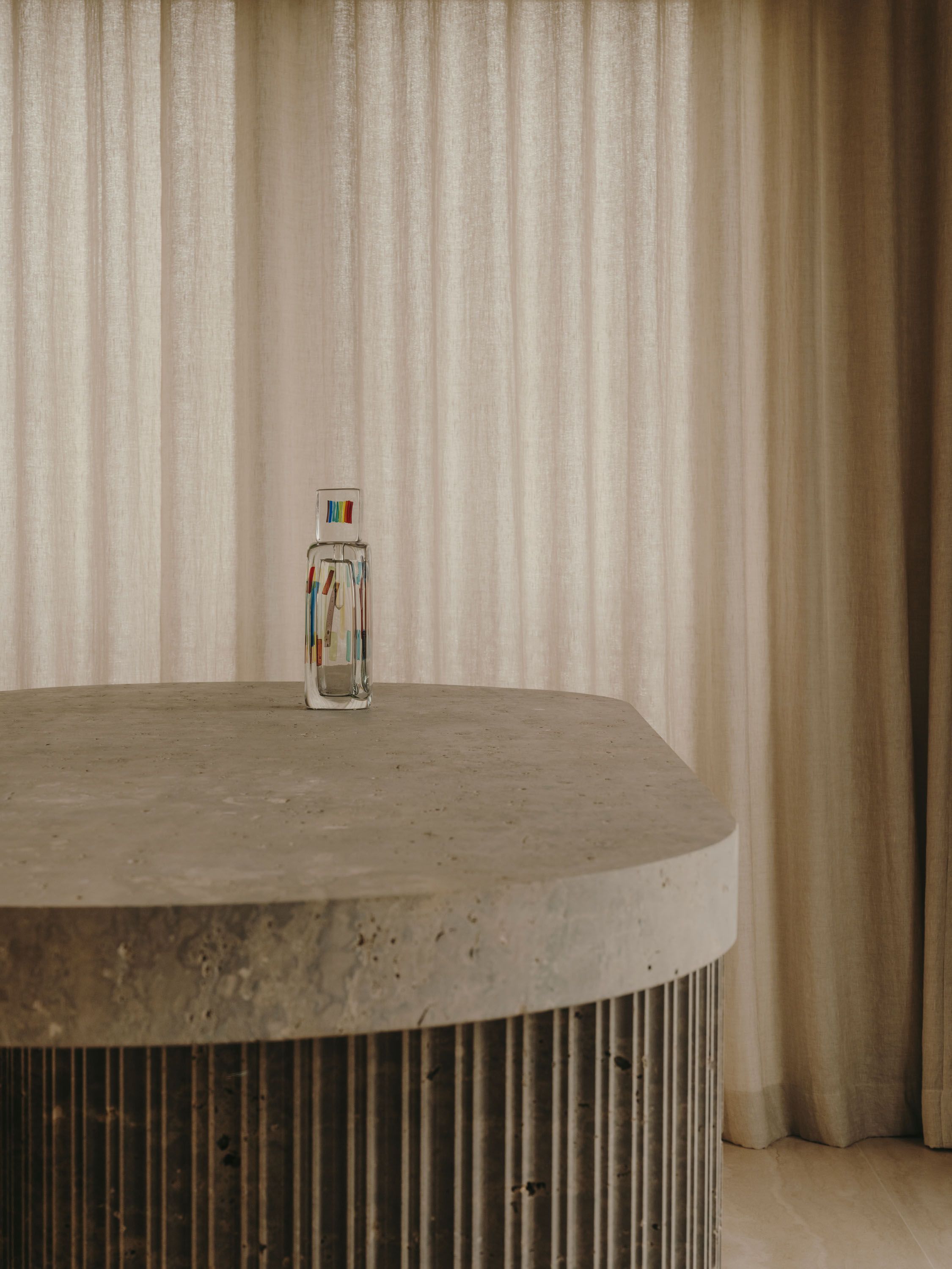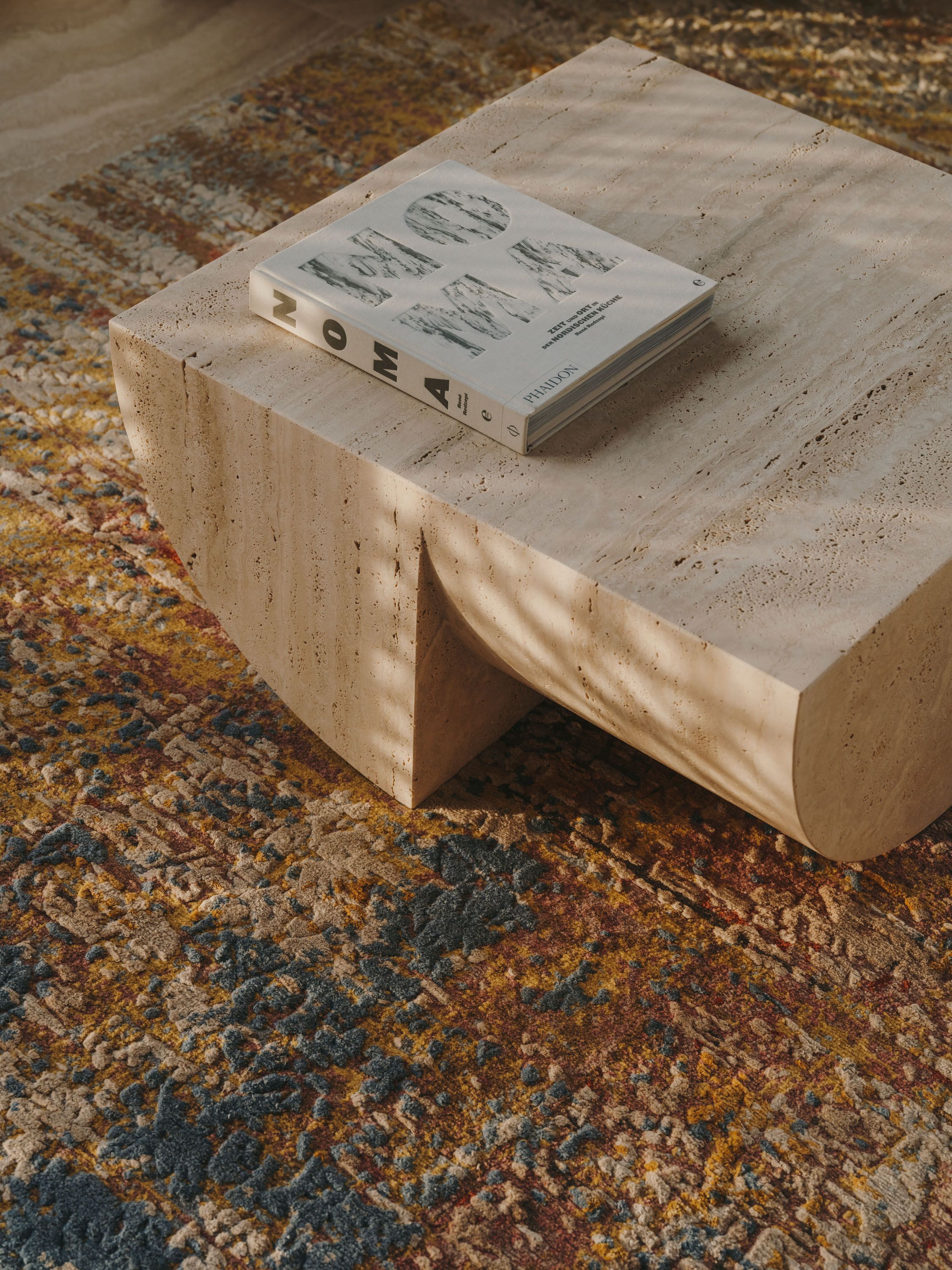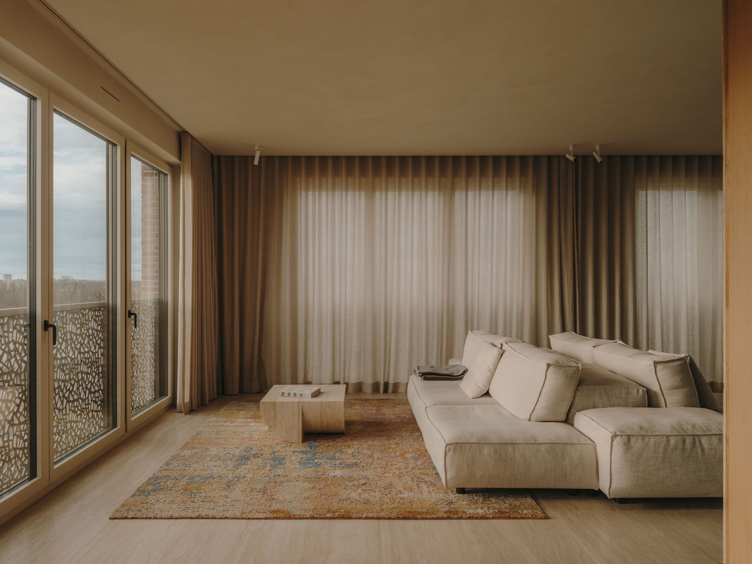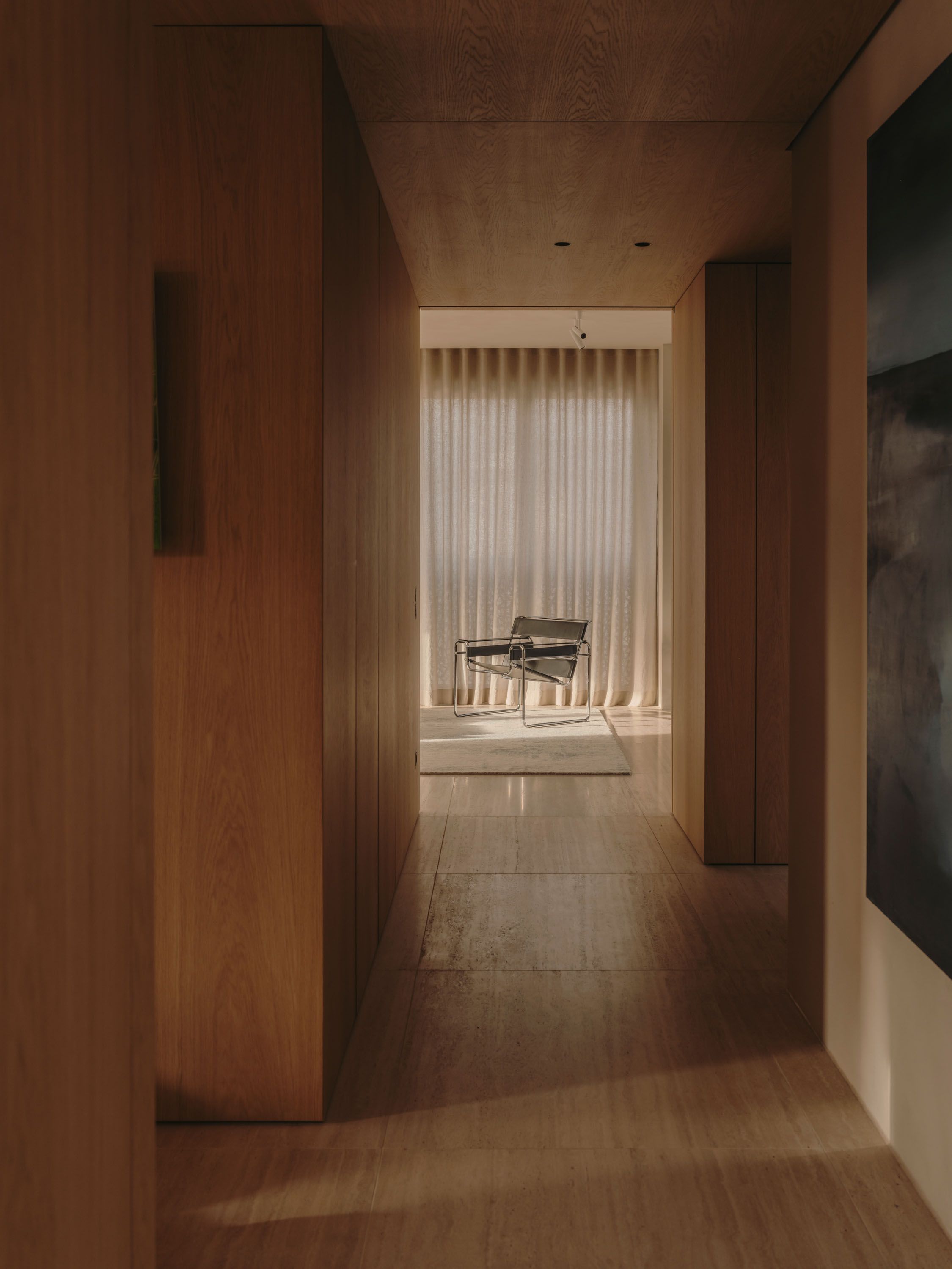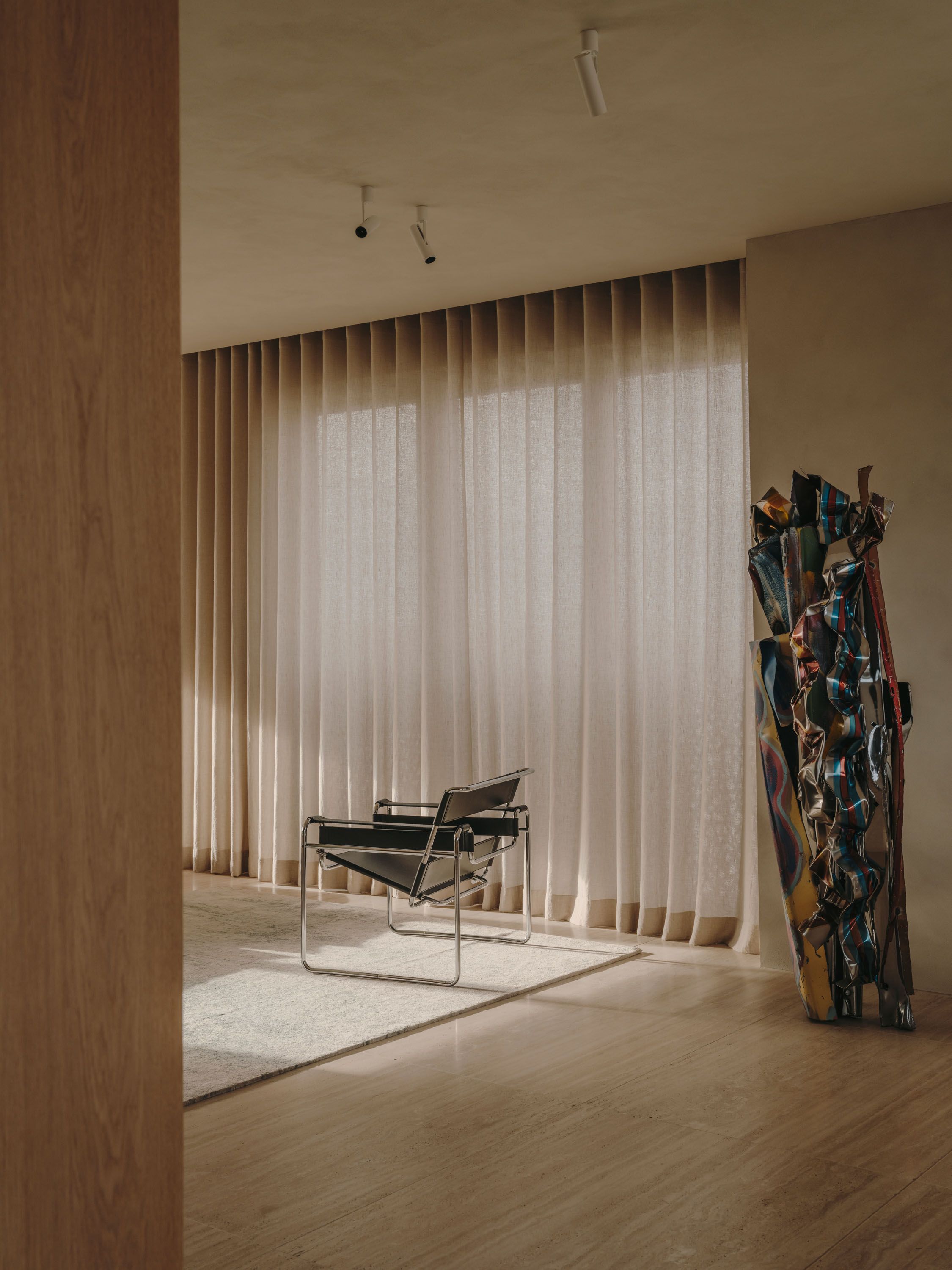 The wooden core integrates functional elements, forms a fluid circulation loop, and uses sliding doors for flexible zoning. The material palette includes travertine floors, Wachenzeller Dolomit washbasins as well as kitchen and bar surfaces, oak veneer built-ins, and Matteo Brioni plaster walls; it also supports the presentation of the client’s art collection.
