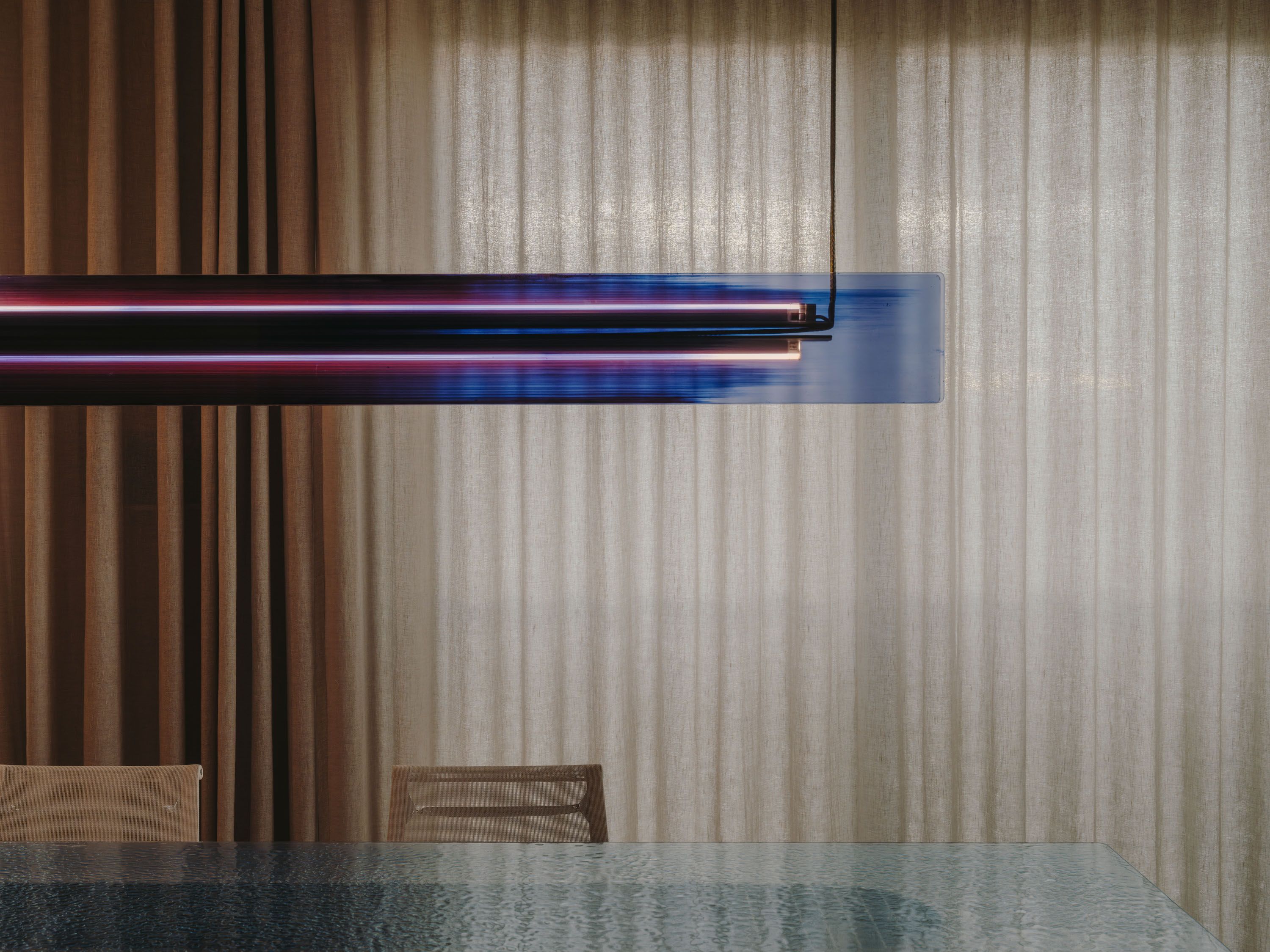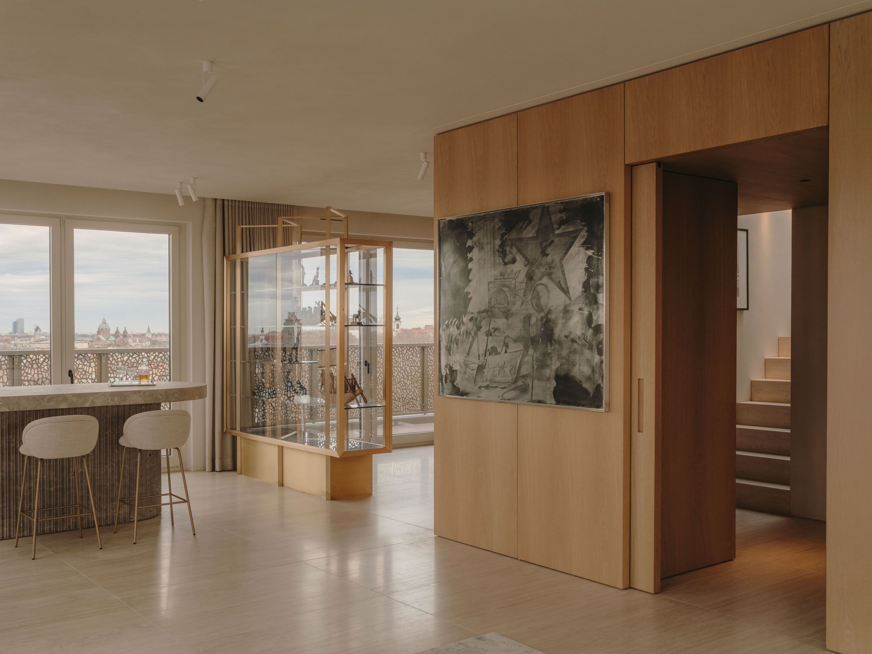 Two adjoining units of a developer-built apartment were connected and completely reimagined. Spanning nearly 300 square meters, the penthouse was conceived as a seamless balance of openness and intimacy. A central wooden core structures the home into living, working, and private retreat zones, allowing expansive sightlines or enclosed areas as needed. A refined, tone-on-tone palette and high-end materials—warm wood, brushed stainless steel, and natural stone—create an atmosphere of calm clarity. A defining highlight is the bar in Wachenzeller Dolomit with swirl-finish stainless-steel fronts, positioned to capture views of the city and mountains.