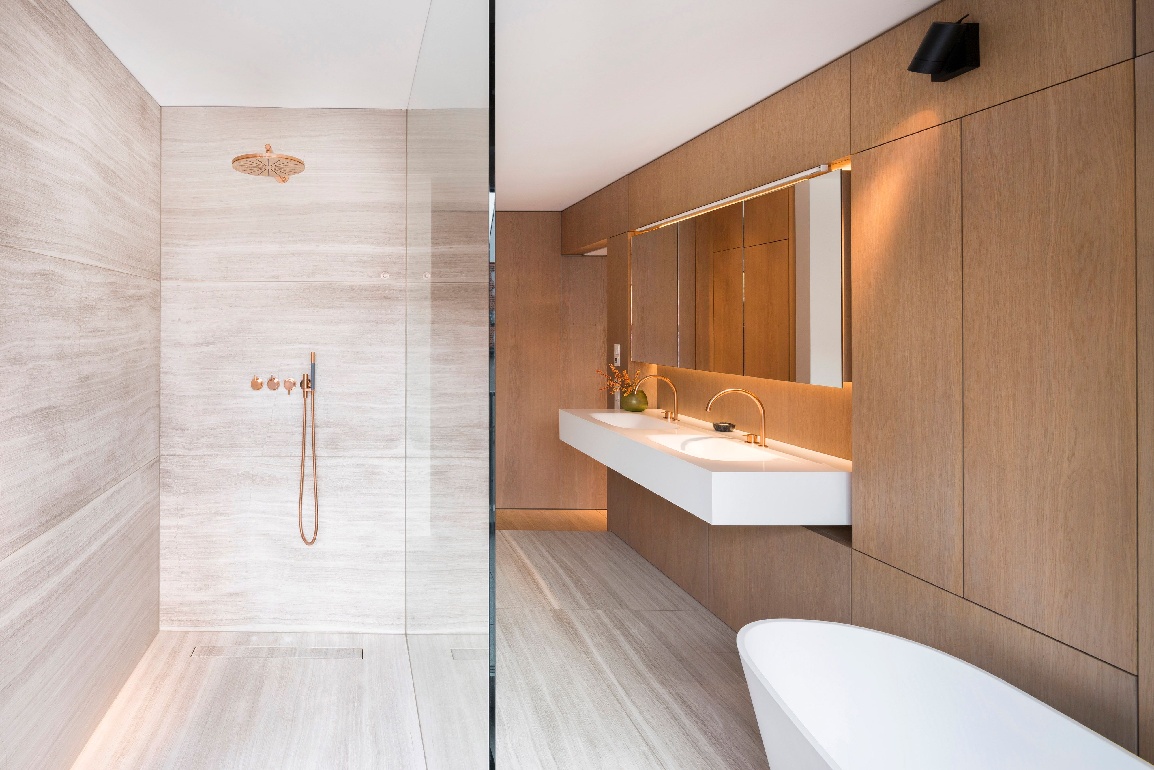Questo appartamento su due piani si trova nel cuore di Monaco di Baviera. Uno degli obiettivi della ristrutturazione era creare un ambiente che ricordasse la suite di un hotel. Per questo, a parte le sedie e i tavoli, si sono scelti esclusivamente arredi fissi che contribuissero alla suddivisione degli spazi. Persino il letto, grazie alla testata integrata nei pannelli a muro, ha assunto il carattere di un pezzo d’arredamento fisso. Seguendo l’idea base del progetto, il design degli interni contribuisce a collegare i due piani, leggermente sfalsati e non identici fra loro, grazie a un elemento d’arredo architettonico in legno di noce americano. La caratteristica alternanza fra pannellatura a superficie liscia e strutturata conferisce all’intero ambiente una particolare dinamicità.