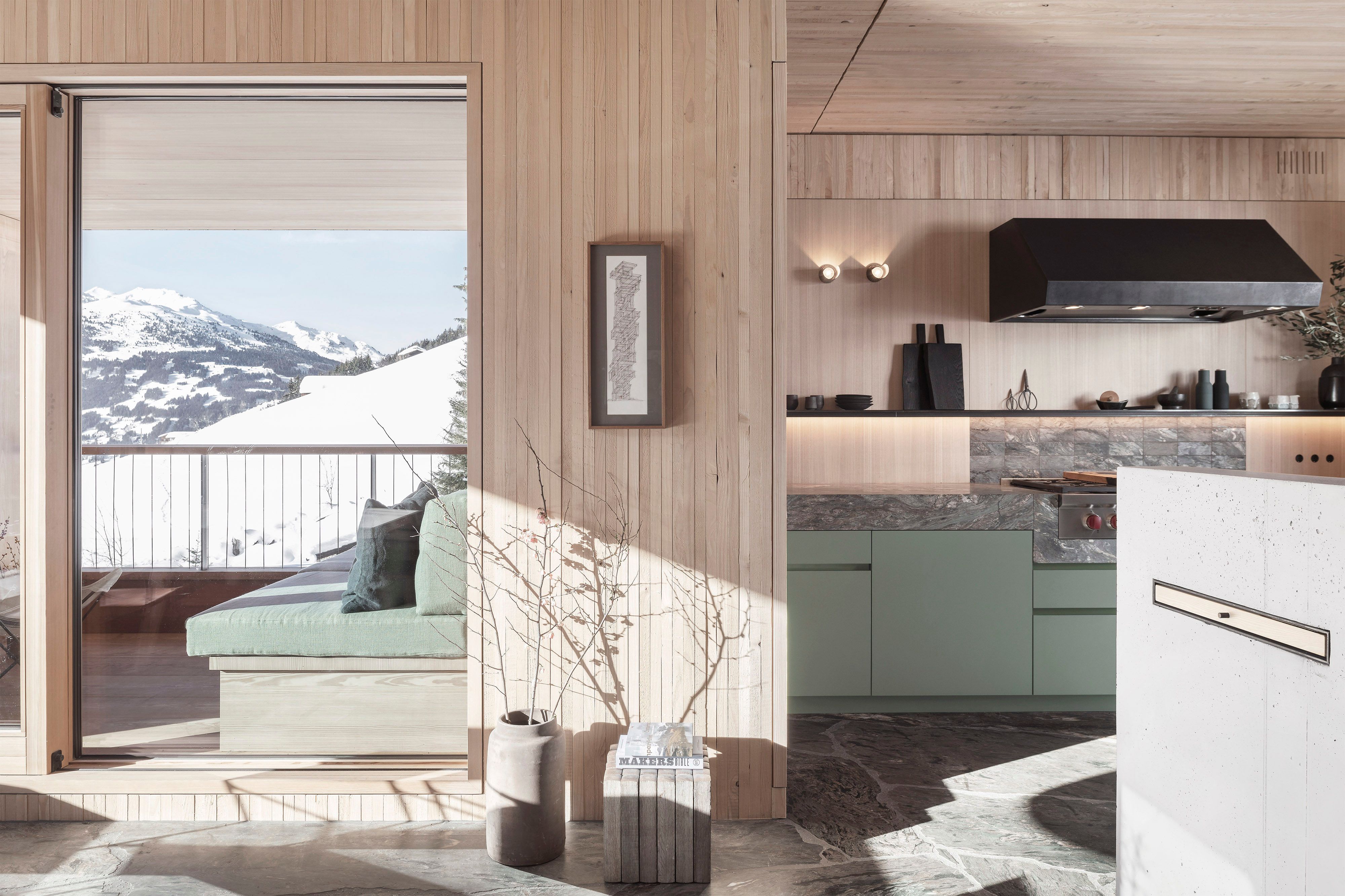Il design della Turmhaus Tirol è ispirato all’architettura regionale degli edifici presenti nella Höhenstraße in Zillertal. Riprende aspetti caratteristici dei fabbricati agricoli circostanti come il tetto a due falde, la loggia e la facciata in legno scurita dal sole, reinterpretandoli in chiave più moderna. La costruzione, progettata in collaborazione con lo studio di architettura Grünecker Reichelt, poggia su un’impronta minimalista di 8x8 metri. Alla base della costruzione in legno vi sono delle fondamenta in calcestruzzo a vista che si aggrappano al pendio. Attraverso di esse si erge, fino al terzo piano, un cavedio tecnico in calcestruzzo con finalità di irrigidimento funzionale per la costruzione in legno, nel quale sono ospitate le canne fumarie e un montacarichi, nonché la cucina nel piano interrato e il camino a piano terra. In ogni stanza il panorama montano è incorniciato da ampie finestre, le logge proiettano lo spazio abitativo verso l’esterno e conferiscono ritmo alla facciata. Le aree esterne in cui sedersi sono riparate dal vento e all’occorrenza possono essere chiuse grazie a persiane scorrevoli che ricordano le porte di un granaio. All’interno dell’edificio gli arredi architettonici finemente lavorati in legno di larice non trattato offrono un interessante contrasto al calcestruzzo grossolano e alle pareti rivestite con tavole impilate in legno grezzo. Il legno non è stato trattato né impregnato con olio in modo da mettere in risalto le caratteristiche naturali del materiale. La pavimentazione, le piastrelle a parete e i lavandini sono stati ricavati da blocchi rocciosi rinvenuti negli scavi per le fondamenta.