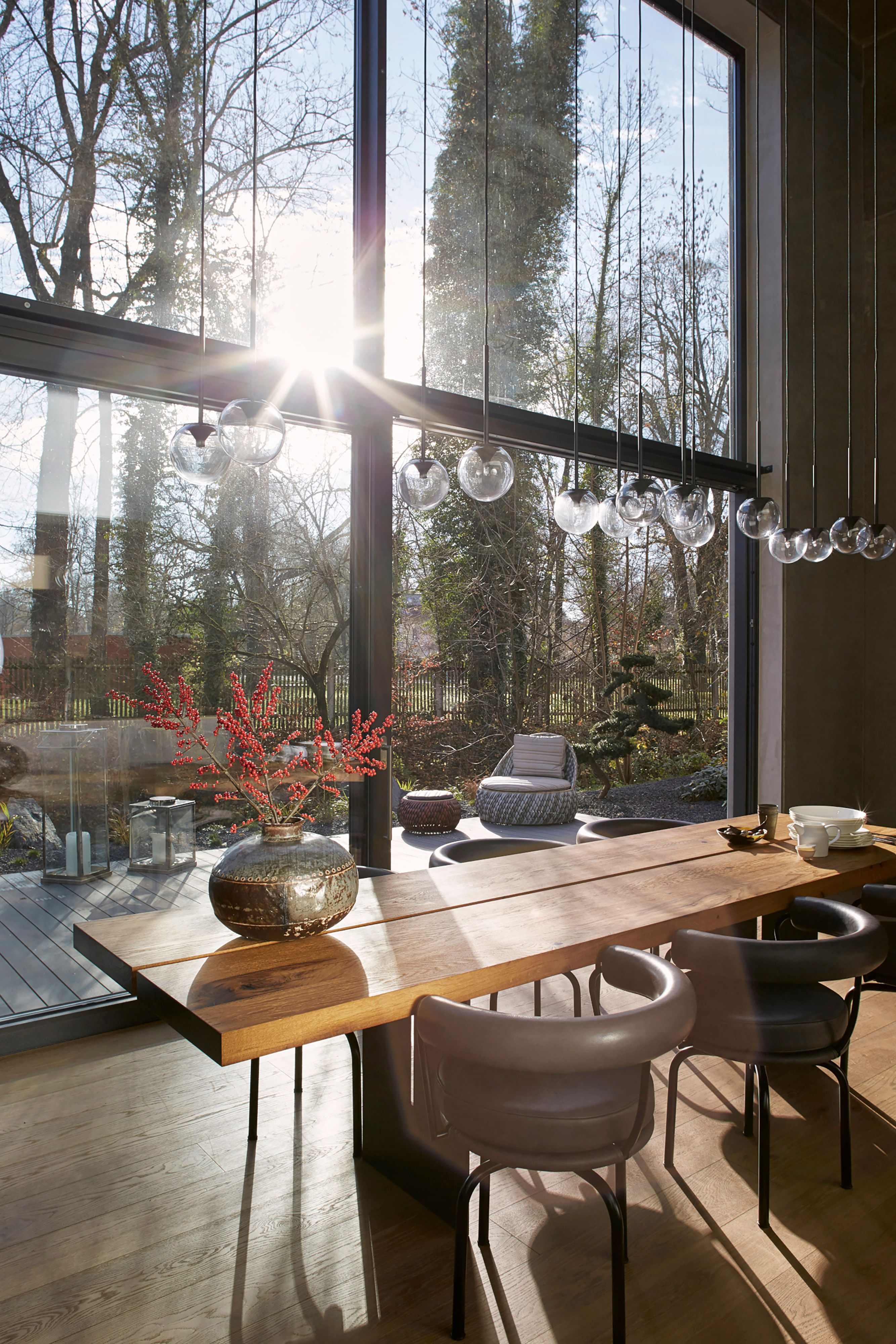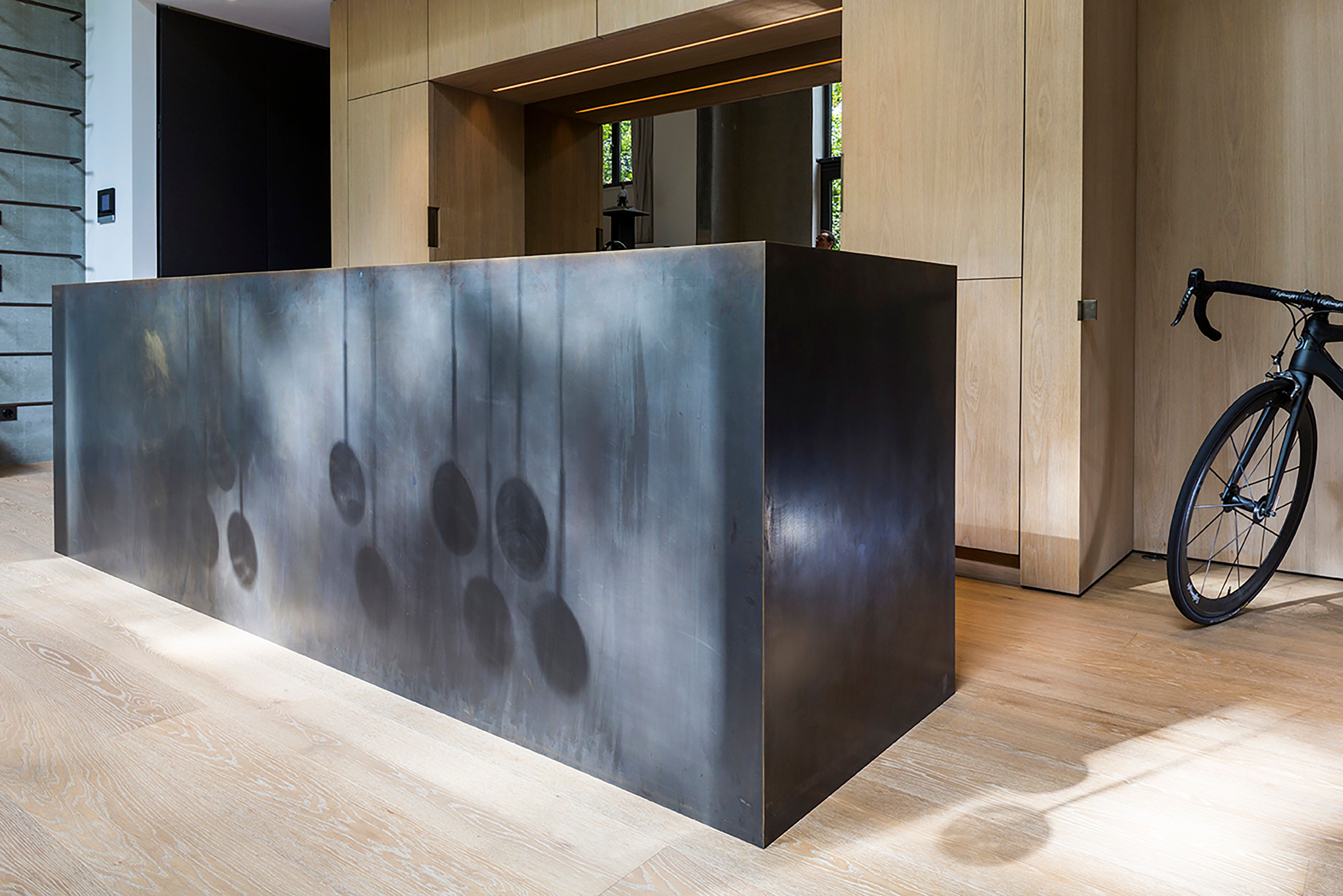 Binnberg Architekturentwicklung erweiterte die Bestandsbauten um ein großzügiges Loft mit Wänden und Decken aus Sichtbeton. Der komplexe Innenausbau der Split-Level-Wohnung umfasst nicht nur diverse Bäder und vielfältige Stauraumlösungen, sondern auch eine zentrale Küche. Dort füllte Holzrausch bestehende Nischen mit maßgefertigten Einbaulösungen und ergänzte sie mit einer Kochinsel und einer langen Tafel. Als Materialien kommen Eiche und brüniertes Messing zum Einsatz, die einen warmen Kontrapunkt zum kalten Beton setzen.