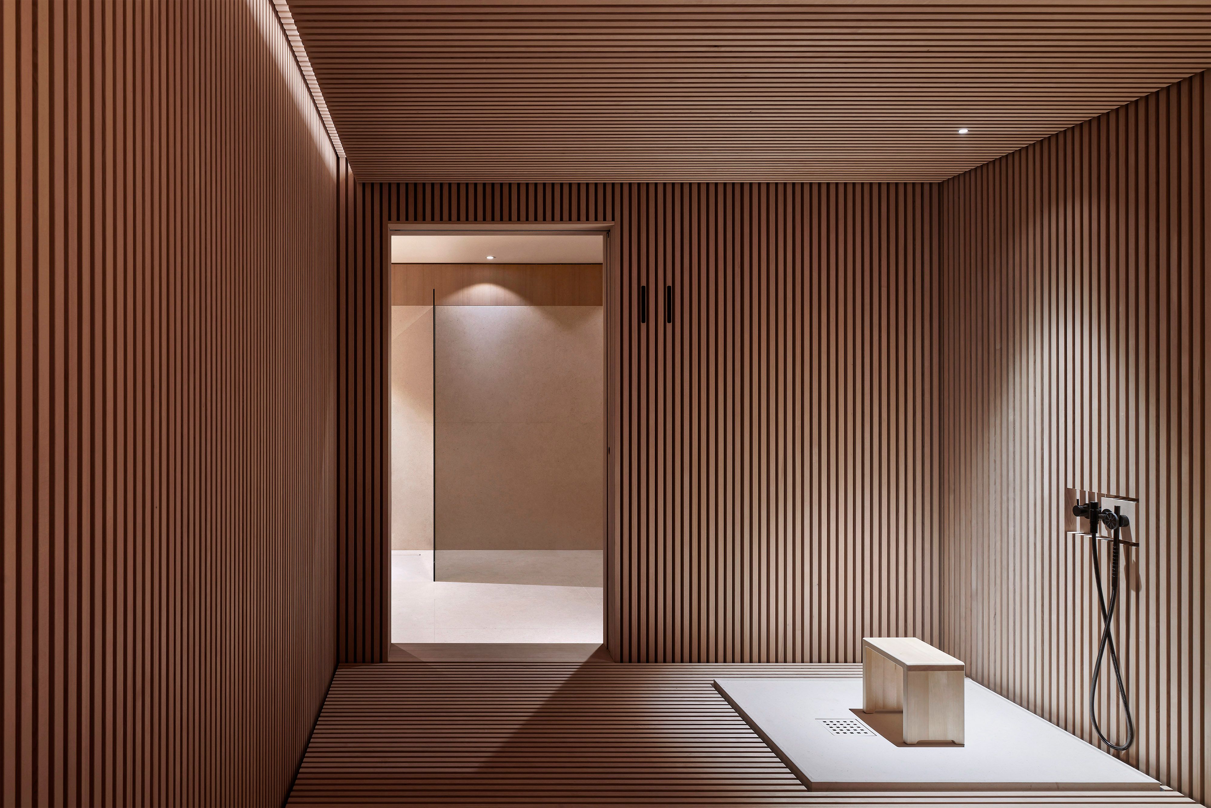 Nichts deutet darauf hin, dass dieses Dachgeschoss eigentlich in einer historischen Gründerzeitvilla liegt. Denn die Bauherrin, die lange in Japan lebte, wünschte sich für ihr Haus einen großzügigen Spa-Bereich, der sie an die japanische Badekultur erinnert. Holzrausch inszenierte für sie ein Onsen, das durch seine durchgängige Gestaltung mit Holzlamellen aus naturbelassenem Hemlock die Präsenz eines meditativen Ruhepols ausstrahlt. Der gezielte Einsatz von indirektem Licht verstärkt diesen Effekt. Das Zentrum des Onsens bildet ein Ofuro-Becken, das von Spezialisten in Japan angefertigt wurde. Das Becken füllt sich innerhalb von 25 Minuten mit bis zu 42°C heißem Wasser. Zu diesem Zweck musste eigens eine weitere Frischwasserleitung verlegt werden.